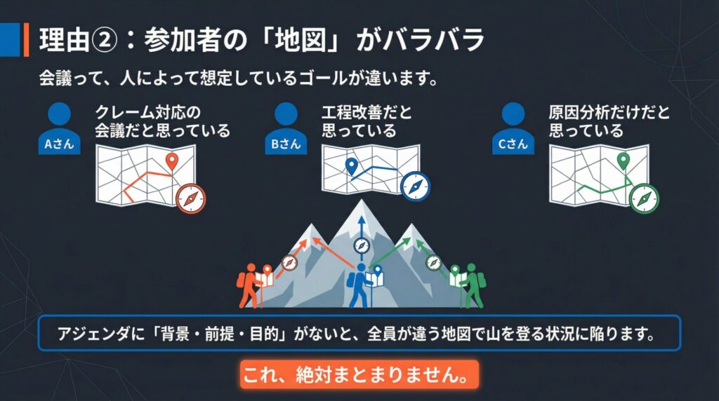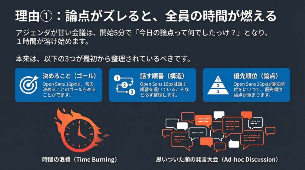 この3つが曖昧だと、会議は “思いついた順の発言大会” になっちゃいます。